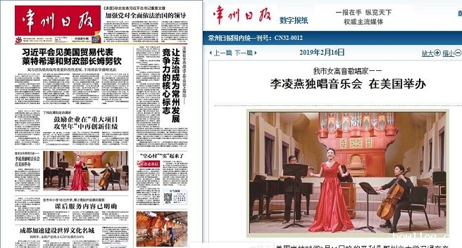 2月16日,《常州日报》头版对我校师范学院教师李凌燕在美国举办独唱音乐会的事迹进行了报道: