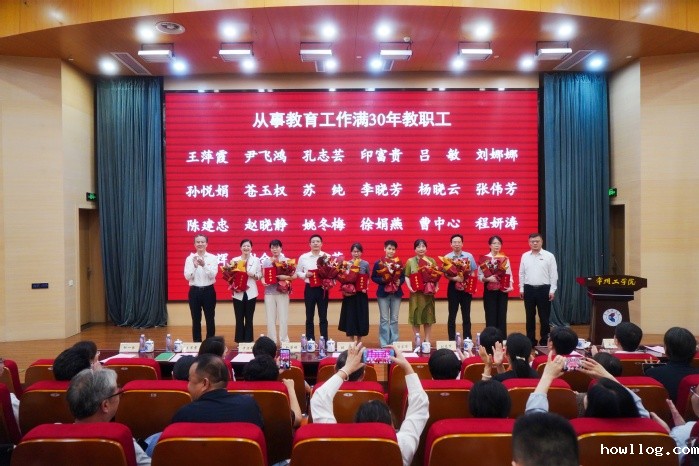 随后,校领导依次为江苏省教学名师,常州市记功人员,2025年度校优秀教师、优秀教育工作者、师德先进个人和集体,从教满30年的教职工颁发荣誉证书。校党委书记汤正华,校党委副书记、校长张兵逐一向荣休教职工代表赠送刻有“言传身教 孜孜不倦”字样的纪念铜盘。青年教师代表为从事教育工作满30年的教职工代表、荣休教职工代表敬献鲜花。一传一递间,既是师德传承的温暖接力,更是教育精神的无声延续。