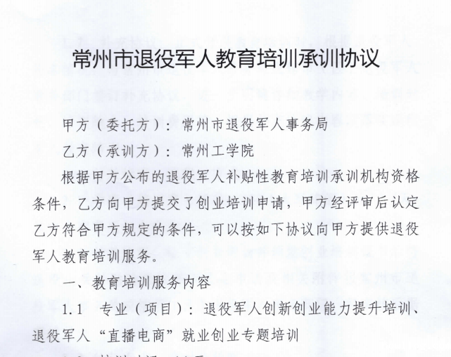 9月2日,常州市退役军人事务局组织召开退役军人教育培训承训机构签约座谈会,我校作为入选的承训单位参加了此次会议,并签订了常州市退役军人教育培训承训协议,承担常州市退役军人创业培训、学历教育等工作。
