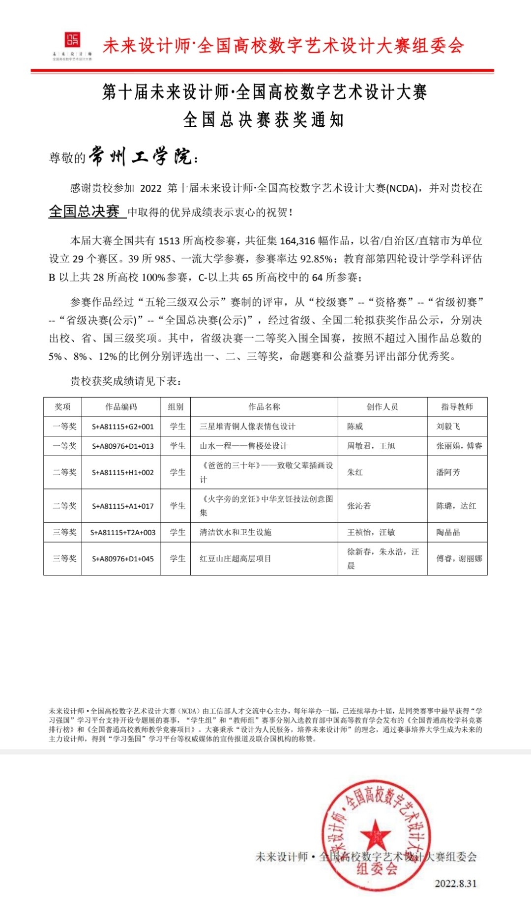 近日,在刚刚结束的第十届全国高校数字艺术设计大赛(NCDA大赛)全国总决赛中,艺术与设计学院的参赛作品表现优异、成绩斐然,经过激烈竞争,斩获一等奖1项、二等奖2项、三等奖1项。在前期的省赛比拼中,我校共获得一等奖6项,二等奖14项,三等奖21项,并荣获江苏省优秀组织单位称号。