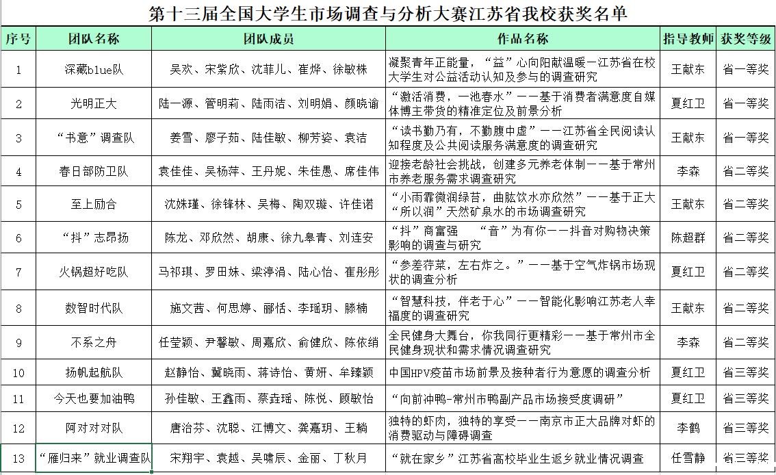 近日,“正大杯”第十三届全国大学生市场调查与分析大赛结果揭晓。来自我校理学院组成的十三支队伍经过半年的调研准备、筹划与实践分析,最终获得江苏赛区省一等奖3项、二等奖6项、三等奖4项。