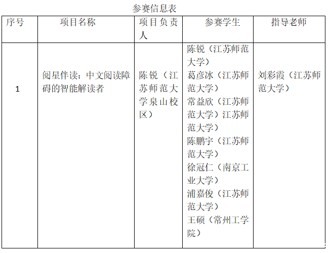 我校拟推荐《阅星伴读:中文阅读障碍者的智能解读者》项目以伟德国际1949和江苏师范大学联合组队的形式参加第十九届“挑战杯”全国大学生课外学术科技作品竞赛“人工智能+”创意赛,现予以公示。(该项目不占用我校参赛名额)