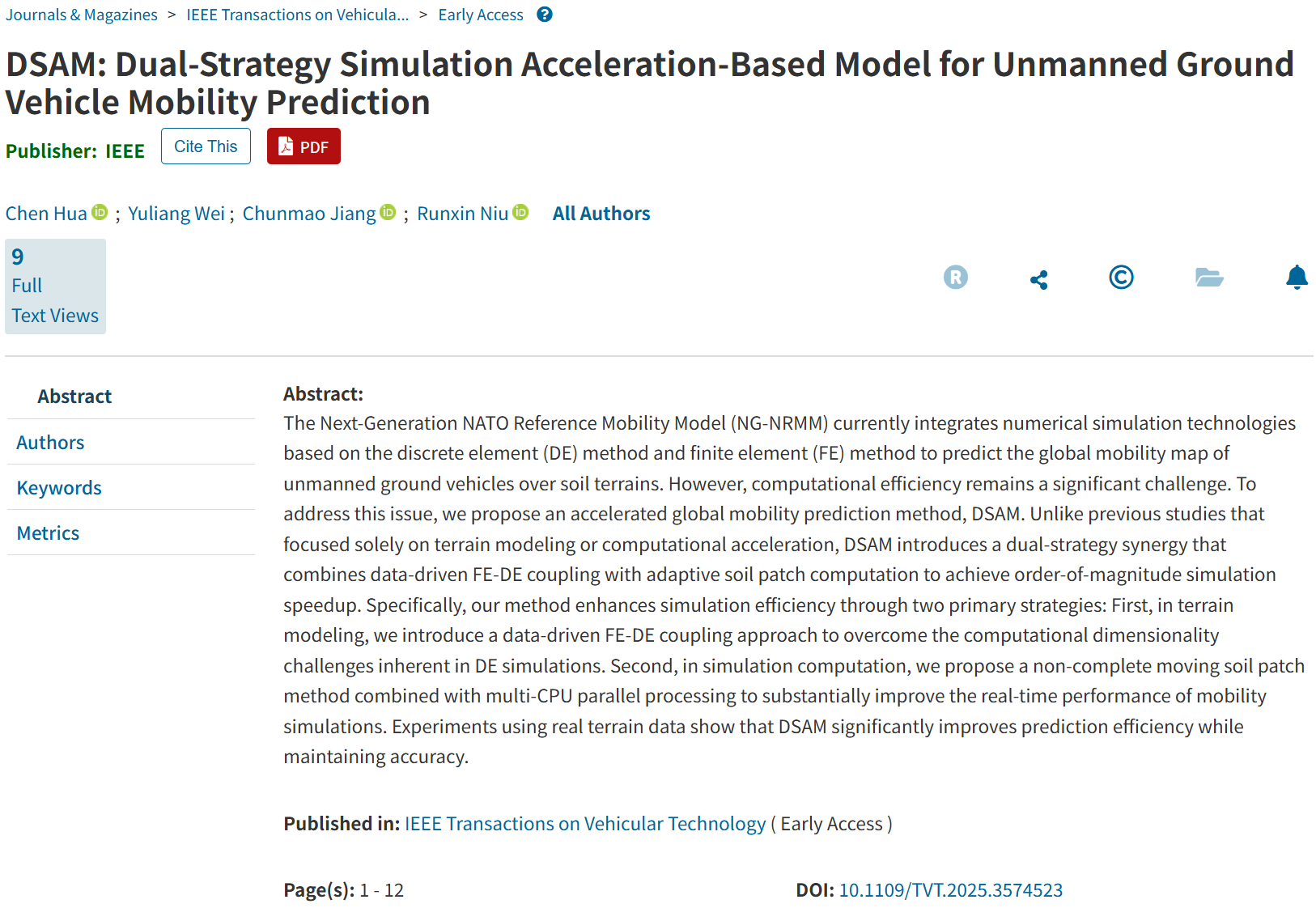 近期,我校电气信息工程学院/自主无人系统研究团队在智能车辆领域发表1篇最新研究成果,该成果以《DSAM: Dual-strategy simulation acceleration-based model for unmanned ground vehicle mobility prediction》为题发表在《IEEE Transactions on Vehicular Technology》上,我校为第一单位,华琛博士为第一作者和共同通讯作者。