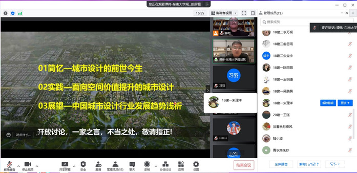 2022年5月20日,东南大学城市规划设计研究有限公司二所所长谭伟应邀为建筑学系作了题为“面向空间价值提升的城市设计思与行”的讲座。讲座在线上举行,建筑学系师生及常州其它高校与设计院相关人员70余人参与。