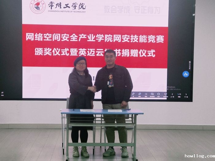 首先进行网络安全技能书籍捐书仪式。常州英迈云信息科技有限公司总经理周雷向计算机网络空间安全协会会长吴浩然捐书。一本本网络技能书籍,犹如知识的火种,从周雷总经理手中传递到吴浩然同学手中,这些书籍为学院的学子们在网络安全知识学习提供支持,丰富学习资源,激发他们对网络安全领域更深入的探索欲望。捐赠书籍是知识传承与共享的象征,为学院营造了更加浓厚的学术氛围。