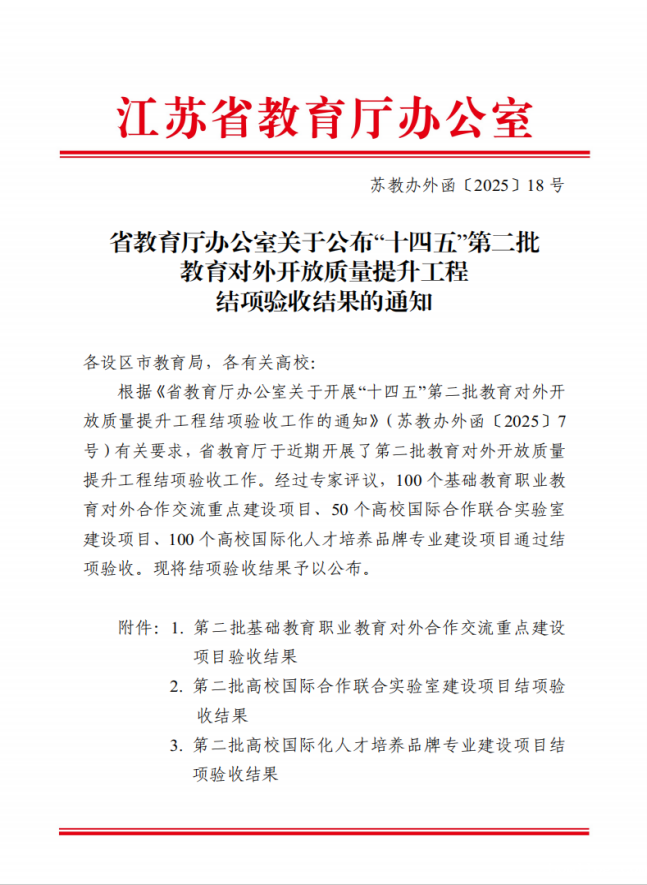 近日,江苏省教育厅办公室下发《关于公布“十四五”第二批教育对外开放质量提升工程结项验收结果的通知》(苏教办外函〔2025〕18号),我院软件工程专业顺利通过“国际化人才培养品牌专业建设项目”结项验收。